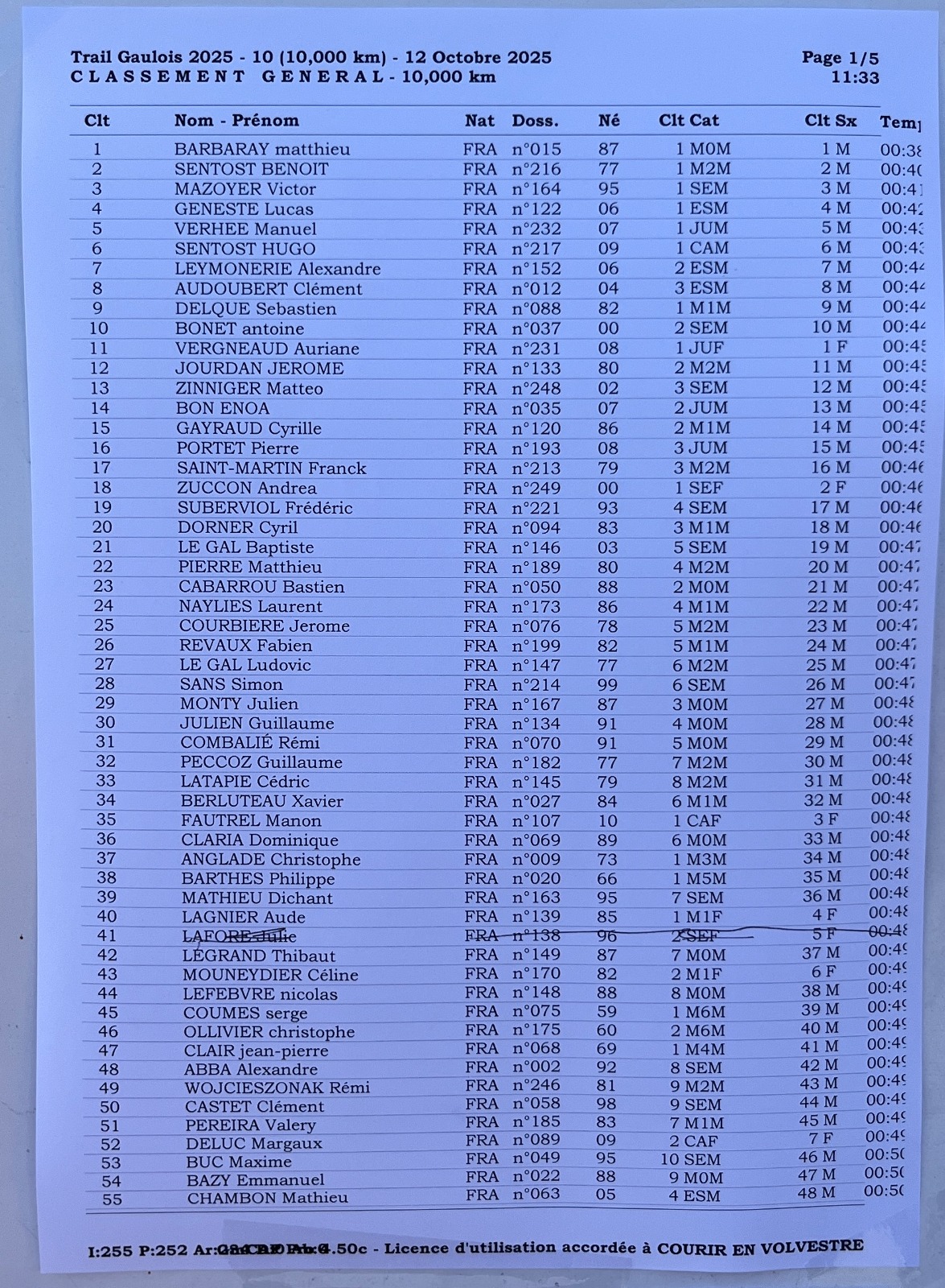 Pour cette potentielle dernière édition du trail gaulois, les druides locaux ont pu compter sur 156 participants sur les 2 distances proposées (10 et 20km) La traversée de l'archéo-site du village gaulois de Saint-Julien ne laisse toujours personnes indifférent..."ils sont fous ces gaulois!" Sur le 20km, Killian PAYRAU a régné en maître tout au long de la course et passe la ligne en 1h31"40' malgré la pression de son poursuivant Guillaume JULIEN arrivant tout juste 9 secondes derrière lui ! Chez les filles, Gaëlle COLAS (Team St-Elix) étalonne le chrono en 1h49"33' LE 10KM a vu le retour en grande forme de Bruno AGERRY qui met tout le monde d'accord avec quasiment 4min d'avance sur Paul ESTOUP en franchissant la ligne en 40"25' Nadia THOREAU confirmera que les Irréductibles Bipèdes de Cazères sont en grande forme en remportant ce 10km en 48"50' Les druides organisateurs du TRAIL GAULOIS étant a court de potion magique se sont rapprochés des associations voisines pour tenter de faire perdurer ce TRAIL qui ne compte plus le nombre de ses éditions
